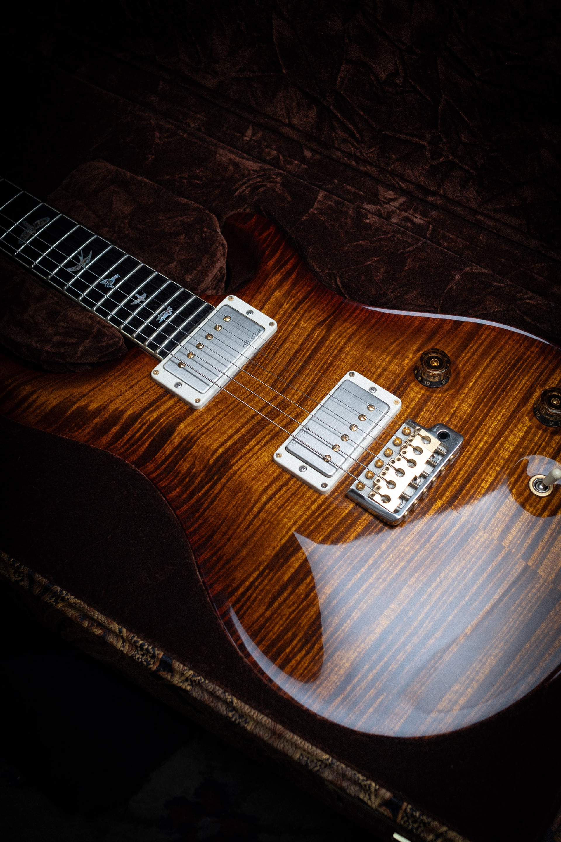 Una construcción impresionante de Mahogany en su cuerpo, con un top de Carved Maple flameado de un nivel supremo. Neck de un finísimo East Indian Rosewood con perfil “Pattern”. Su fretboard también de Rosewood, que como pueden ver está decorado con unas terribles incrustaciones de madre perla con el centro de Paua en forma de aves en pleno vuelo, un clásico PRS, muy top.