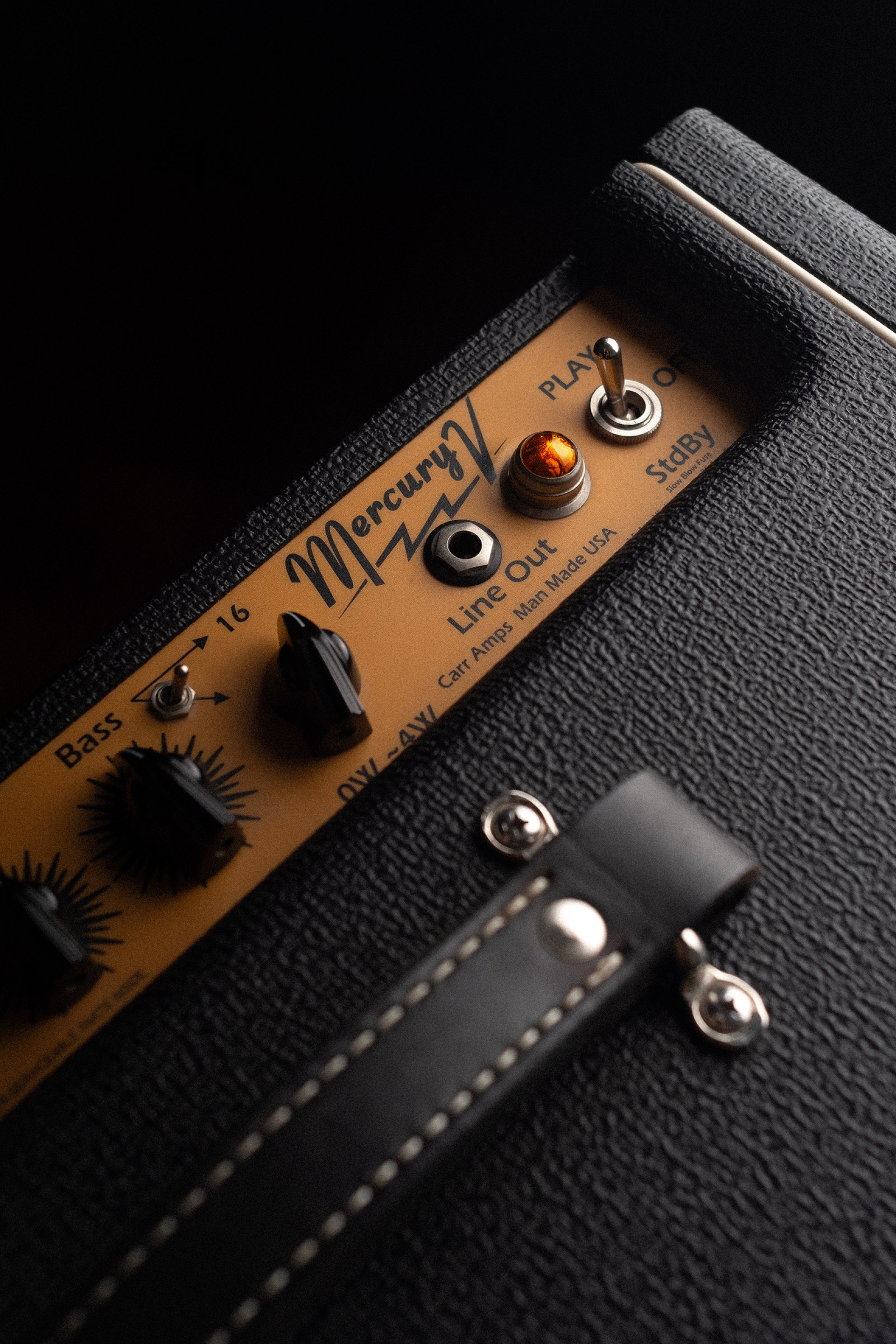 Carr Mercury V Head, 16w totalmente valvulares, equipado con 2x 6V6GT (power), 4x 12AX7 (preamp), con su atenuador estrella que nos permite llevarlo desde 0v hasta su máximo esplendor. Reconocido por entregar un clásico British tone, y a la vez ser súper versátil.