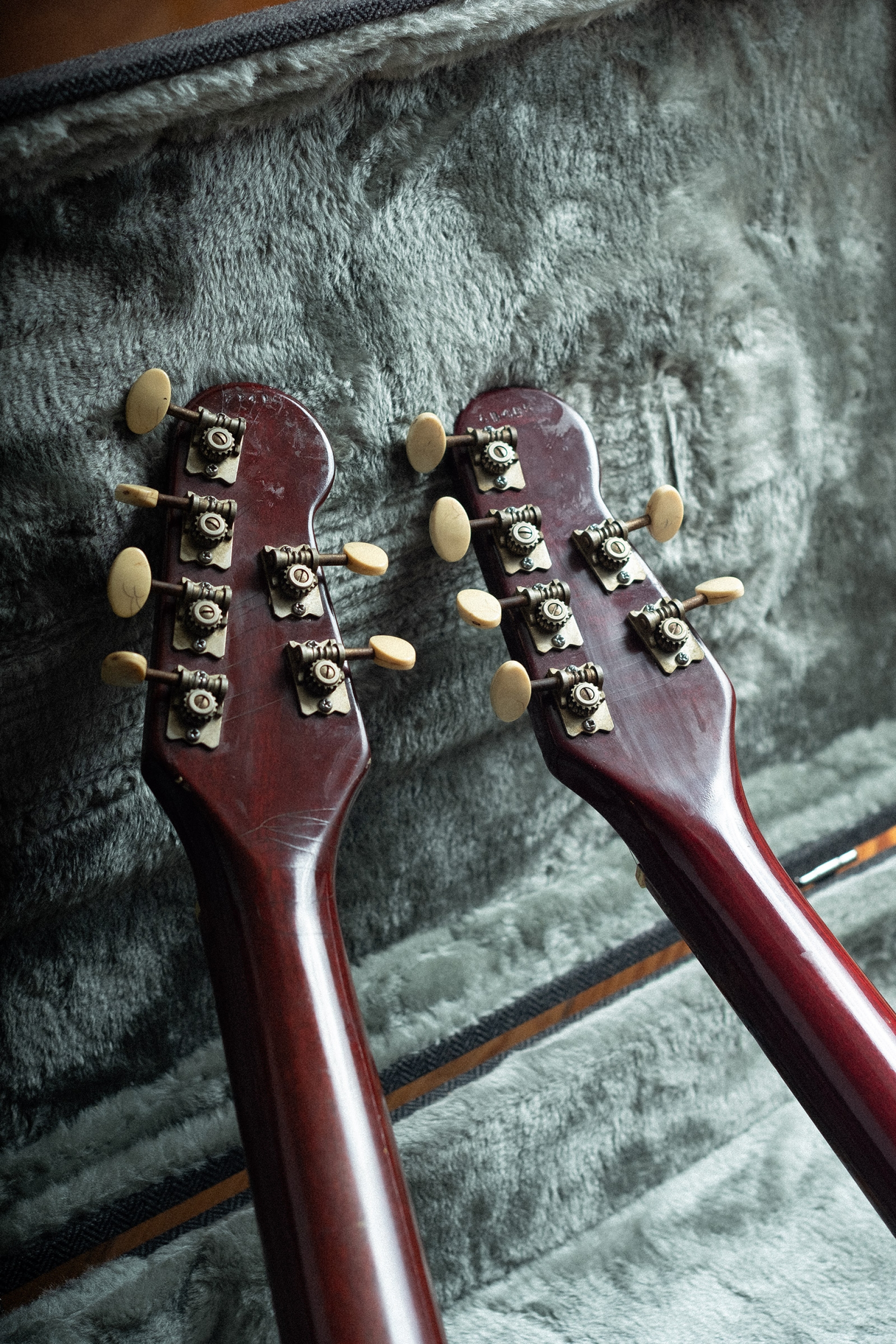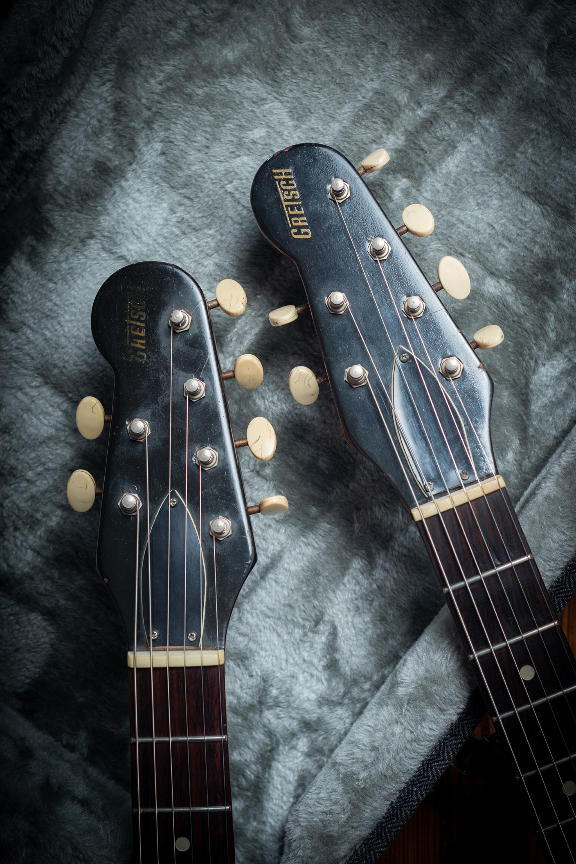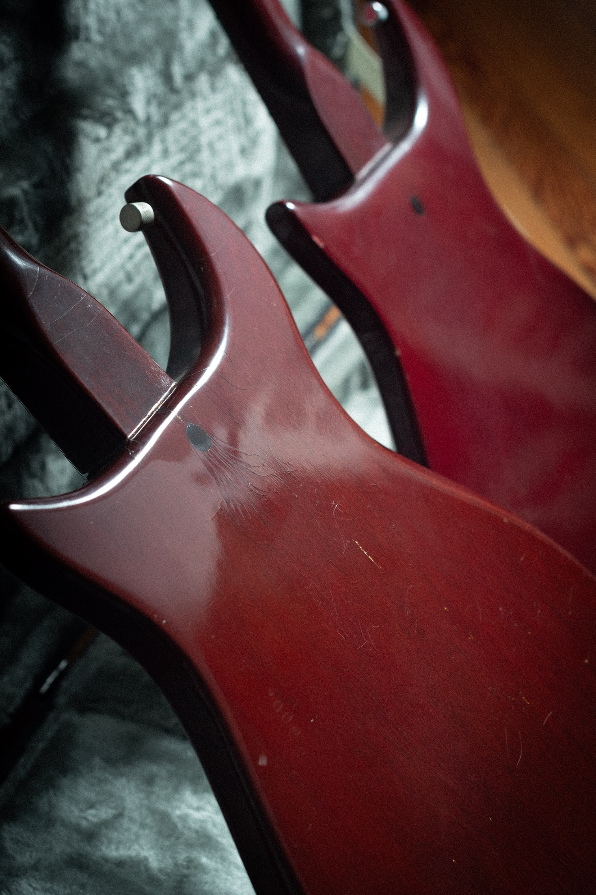 Como podrán ver una de ellas tiene el pickguard inflado, reacción generada por los gases del metacrilato utilizado en algún momento como pegamento del mismo.