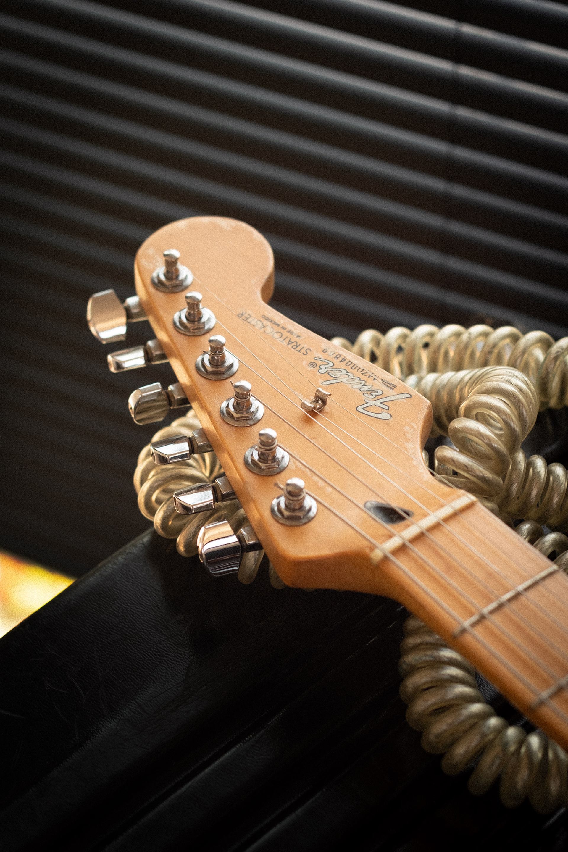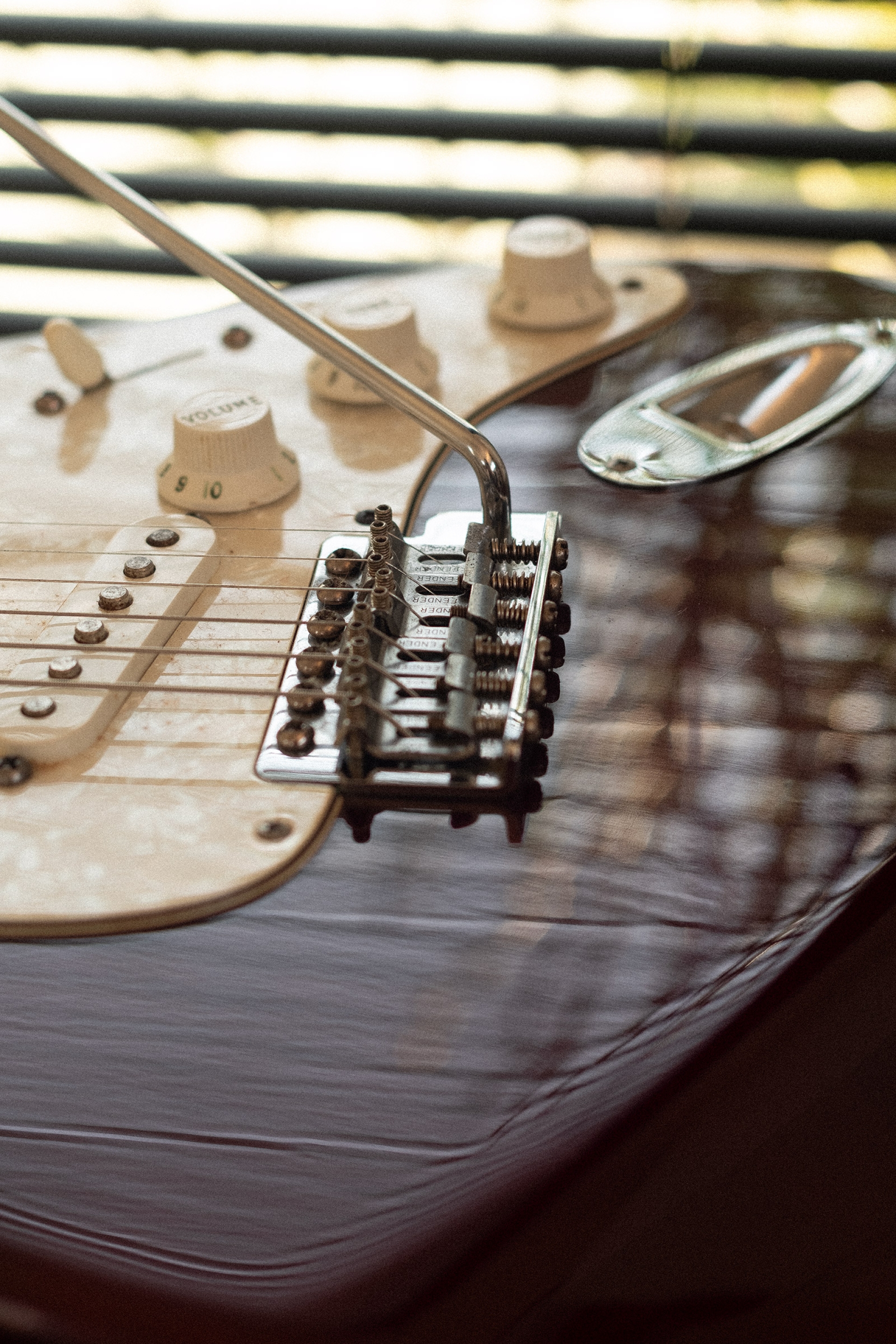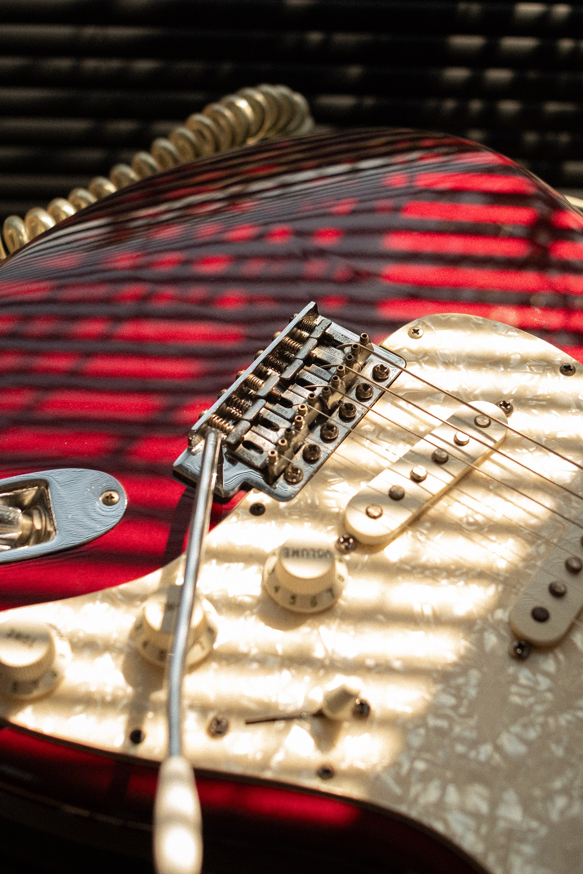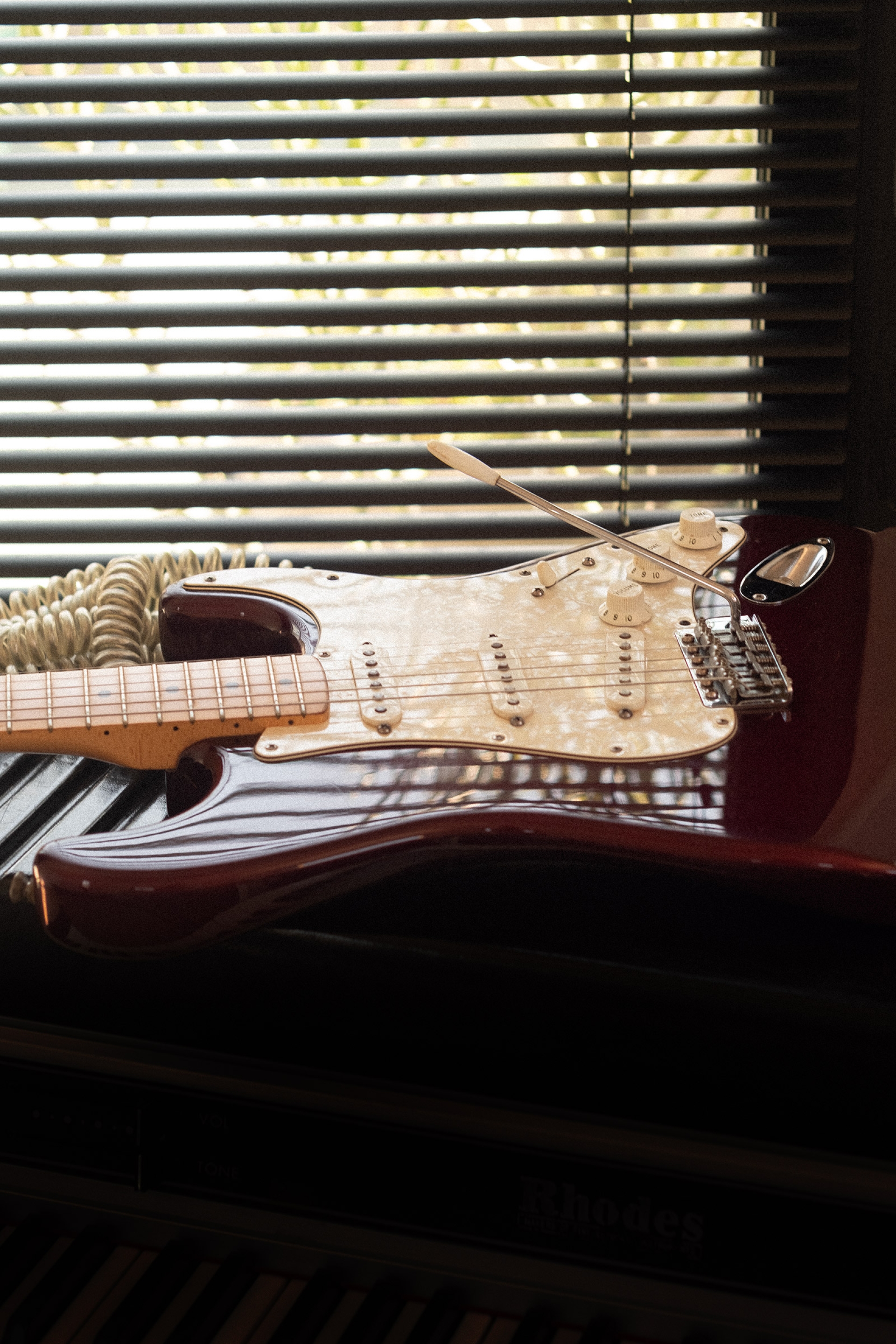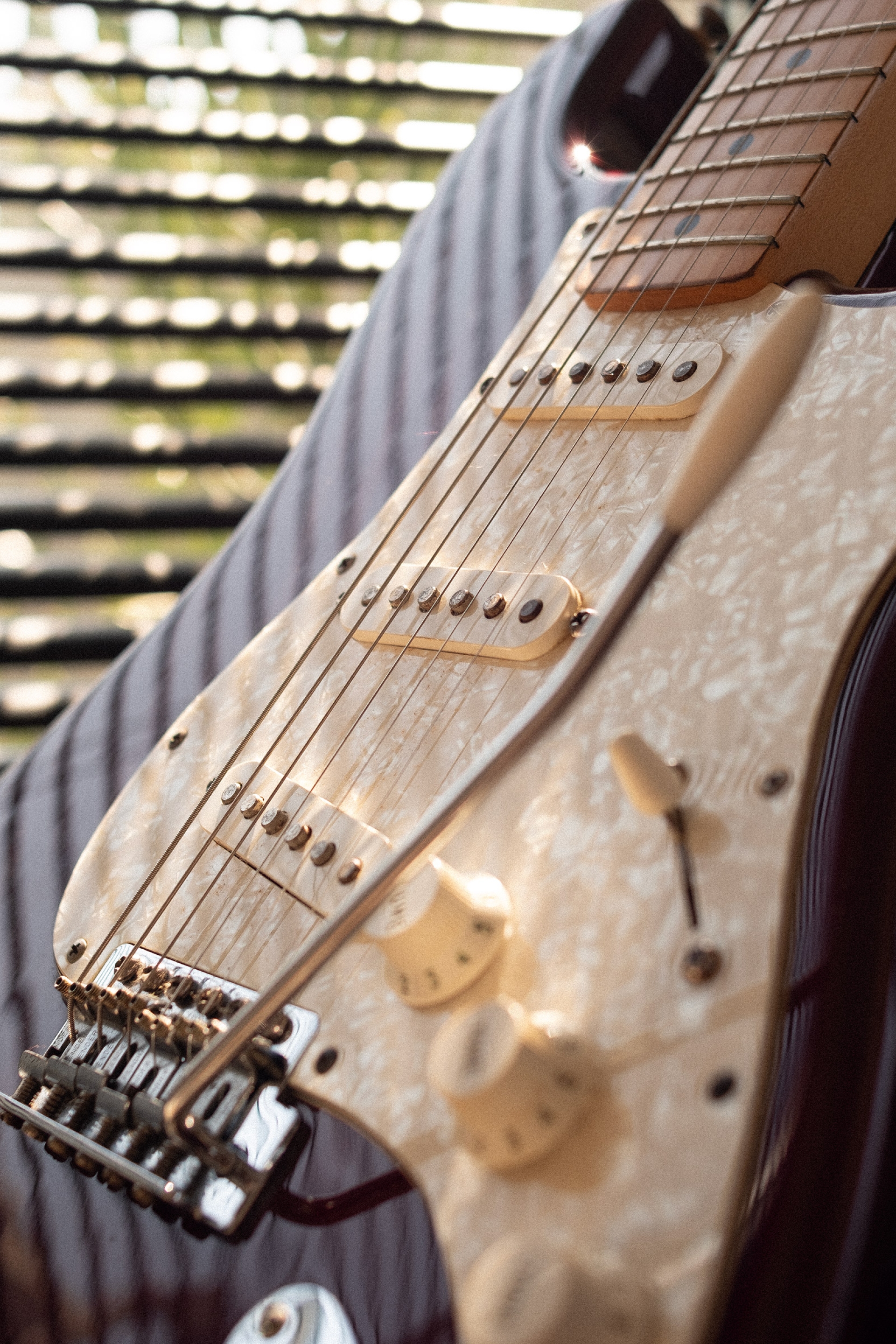Fender Stratocaster MIM del año 2000 en impecables condiciones en un Midnight Wine finish, pickguard nacarado, neck y fretboard de maple radio 9.5”, pickups cerámicos de un audio muy contundente.